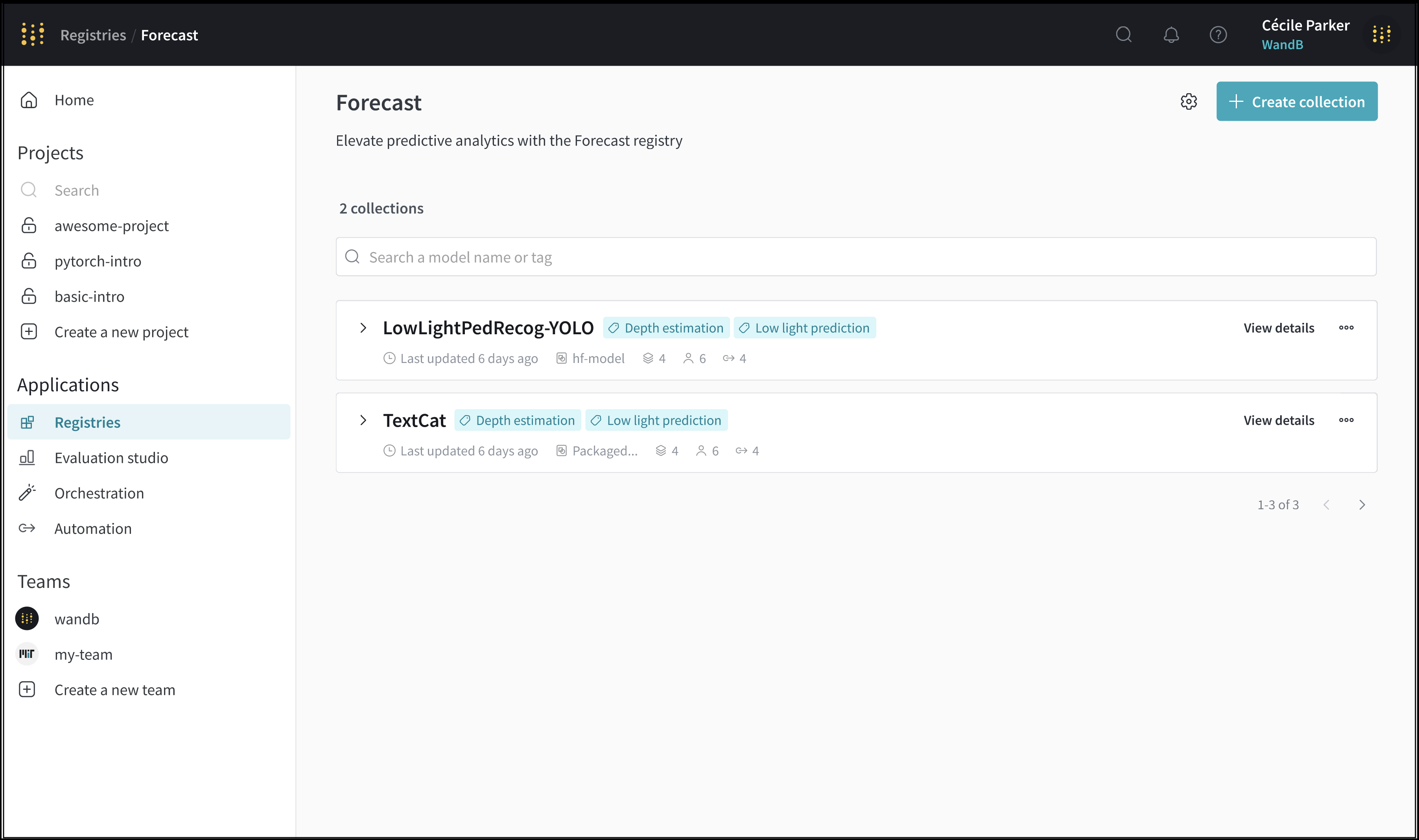 例えば、上の画像は「Forecast」という名前のレジストリを示しています。「Forecast」レジストリ内には、「LowLightPedRecog-YOLO」と「TextCat」という2つのコレクションがあります。